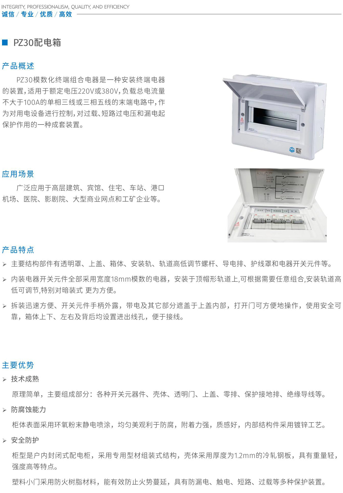 PZ30模数化终端组合电器是一种安装终端电器的装置,适用于额定电压220 V或380 V,负载总电流量不大于100 A的单相三线或三相五线的末端电路中,作为对用电设备进行控制,对过载、短路过电压和漏电起保护作用的一种成套装置。
