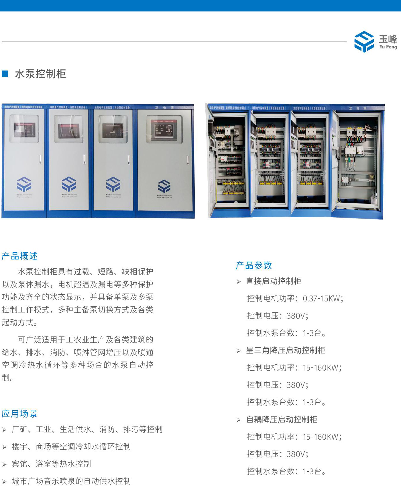 水泵控制柜具有过载、短路、缺相保护以及泵体漏水,电机超温及漏电等多种保护功能及齐全的状态显示,并具备单泵及多泵控制工作模式,多种主备泵切换方式及各类起动方式。