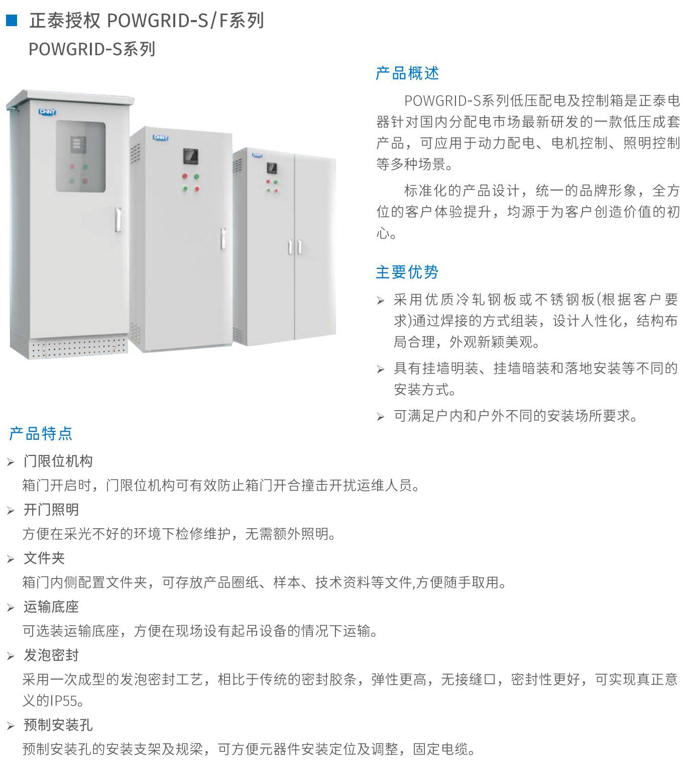 POWGRID-S系列低压配电及控制箱是正泰电器针对国内分配电市场最新研发的一款低压成套产品,可应用于动力配电、电机控制、照明控制等多种场景。